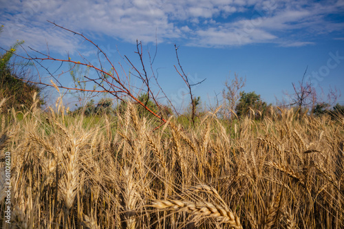 Fototapeta premium dry ears of wheat in the field and branch