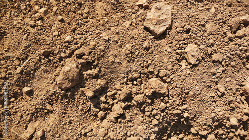 Obraz premium Dry earthy soil texture with compact rough surface and natural ground detail perfect for geology, backgrounds, and design visuals