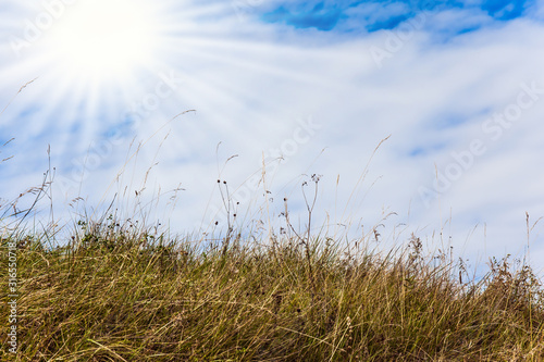 Fototapeta premium Dry grass and sun in the clouds