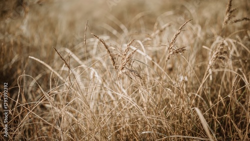 © Lasvu, Fototapeta premium Dry grass and wheat stalks in a field, with a warm, golden background.