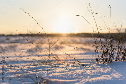© Dvoeglazov, Fototapeta premium dry grass and winter sunset