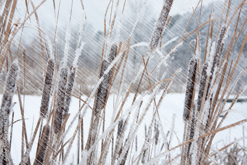 © Pawel Horazy, Fototapeta premium dry grass covered with snow, trees in the background and falling snow