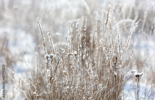 © schankz, Fototapeta premium Dry grass in the snow in winter