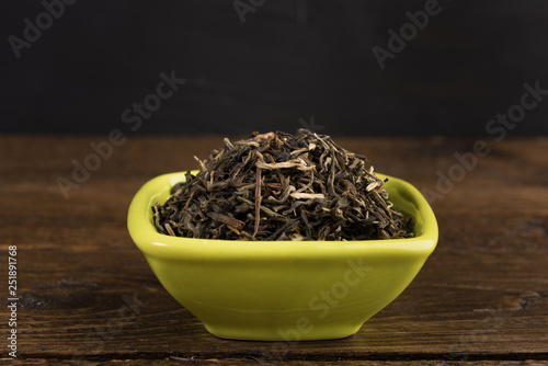 © Konstantin Maslak, Fototapeta premium dry green tea in a clay bowl isolated on wooden table on black background