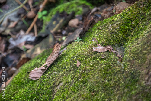 © Luis, Obraz premium Dry leaf on top of a mossy stone