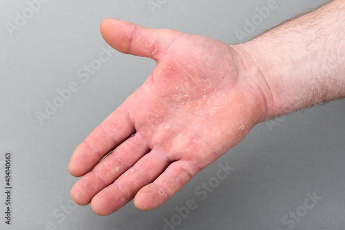 © Natallia, Fototapeta premium Dry man's hand with skin peeling off. Eczema dermatitis.