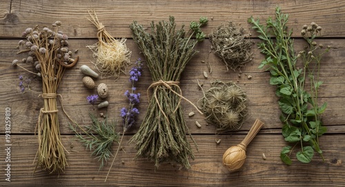 © AkuAku, Fototapeta premium Dry meadow herbs laid out on wood background for traditional healing