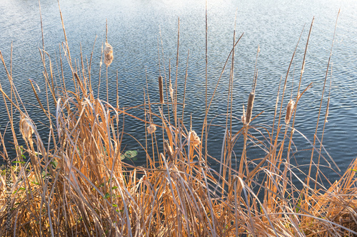 © Hatori_Shisuka, Obraz premium Dry narrow leaves and dry flowers of Cat-tail, Elephant grass, Lesser reedmace, Narrow-leaved Cat-tail (Typha Angustifolia) around the pond