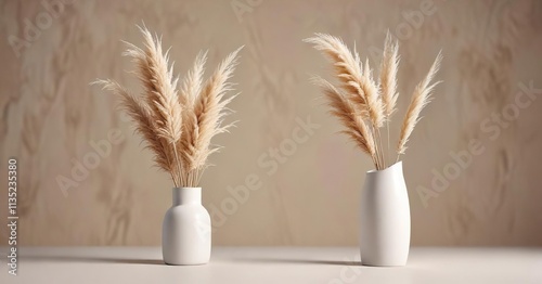 Naklejka premium Dry pampas grass and white deodorant stick on neutral background, bathroom essentials, aromatherapy, warm tones