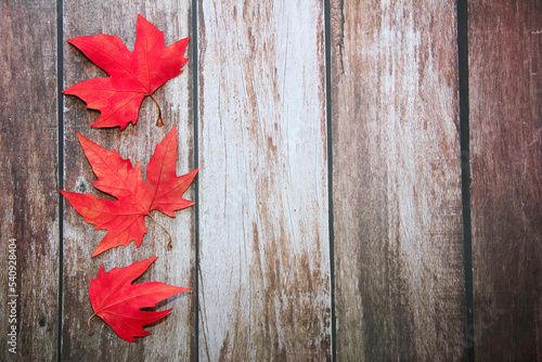Obraz premium dry red maple leaves on a wooden background