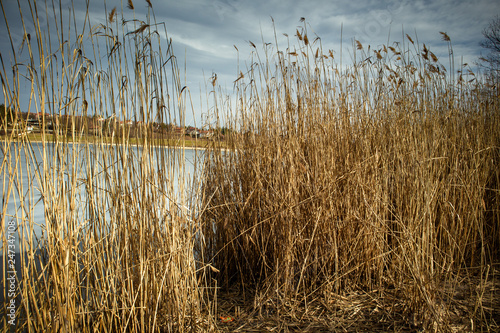 © Milan, Obraz premium Dry reed by the frozen lake. Beautiful sunny winter day.