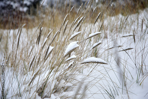Fototapeta premium Dry reed grass covered with white fluffy snow, winter photo, selective focus