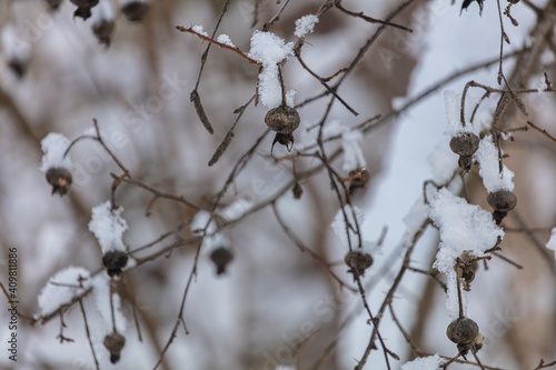 Obraz premium Dry rose hips under the snow.