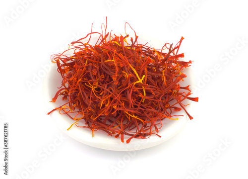 © Gummy Bear, Fototapeta premium Dry Saffron Spice on a Plate Isolated on White Background.