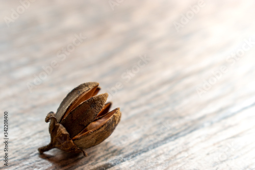© Su_prasert, Obraz premium Dry seeds on wood table.Top view of dry seeds.Wood table background.