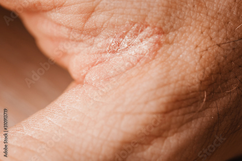 © andrey gonchar, Fototapeta premium Dry skin in cracks in the hand between the thumb and forefinger - dermatology