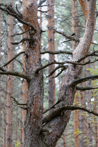 © Andrey Cherkasov, Fototapeta premium dry spreading pine tree in autumn forest