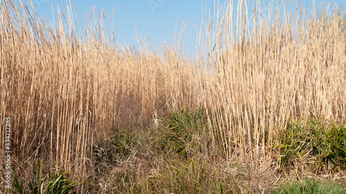 © djenev, Fototapeta premium dry stalks of reed of blue sky