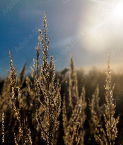 © Rinat, Fototapeta premium Dry stems of yellowed cereals with dew drops