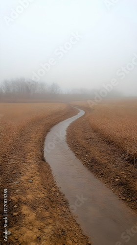 © Mandan, Naklejka premium Dry Streambed Winding Path In Foggy Landscape