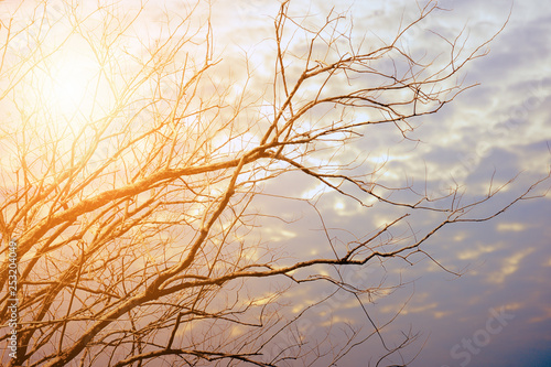 © Mongkolchon, Obraz premium dry tree bushes over sunset sky with sun flare