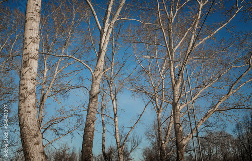 © Lucky Photographer, Fototapeta premium Dry trees against blue sky. Leafless trees. Forest. Natural background. Lamppost