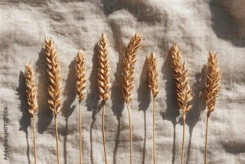 © Artlana, Fototapeta premium Dry wheat stems arranged on a textured rustic fabric background.