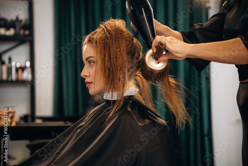 © standret, Naklejka premium Drying the hair. Woman is in a beauty salon with hair stylist