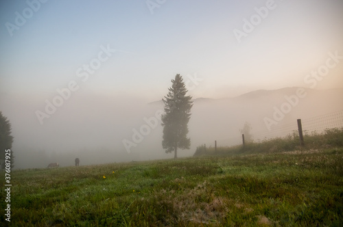 © Monika, Naklejka premium Drzewa na skraju spowitej mgłą łąki na tle gór