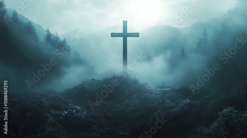 © TranNgoc, Obraz premium Dual exposure of a Christian cross merged with a misty mountain range, the fog swirling around the silhouette of the cross, soft morning light breaking through the mist,