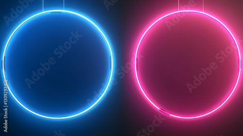 Fototapeta premium Dual Glowing Neon Circles in Blue and Pink Against Dark Background Reflecting...