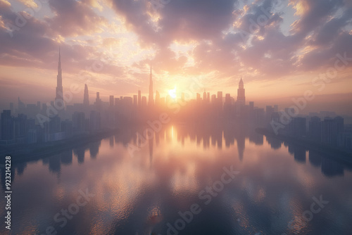 Fototapeta premium Dubai city 3D concept background showcasing the stunning city center skyline with luxury skyscrapers at sunrise, United Arab Emirates.