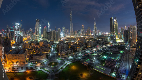 Fototapeta premium Dubai Downtown skyline night to day timelapse with Burj Khalifa and other towers panoramic view from the top in Dubai