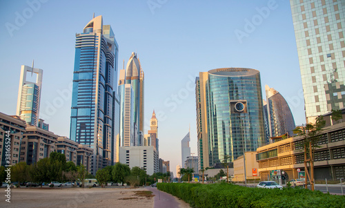 Naklejka premium Dubai Financial Center road. Landmarks such Jumeirah Emirates towers, Ritz Carlton, Park towers, DIFC on the picture.