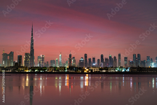 © HLEB, Obraz premium Dubai in night city lights or dusk. Dawn over Burj Khalifa. Nightly Dubai downtown. View from sea to Dubai quay