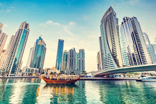 © Photocreo Bednarek, Obraz premium Dubai marina and tourist boat at sunset.