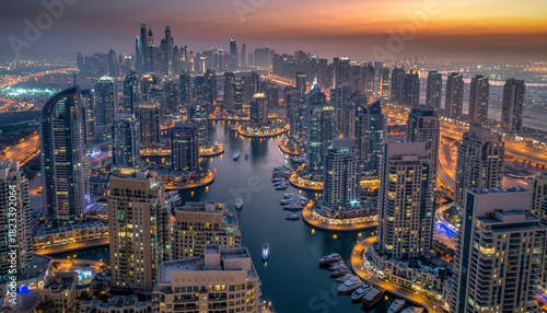 Obraz premium Dubai Marina at Night Illuminated Skyscrapers and Waterways.