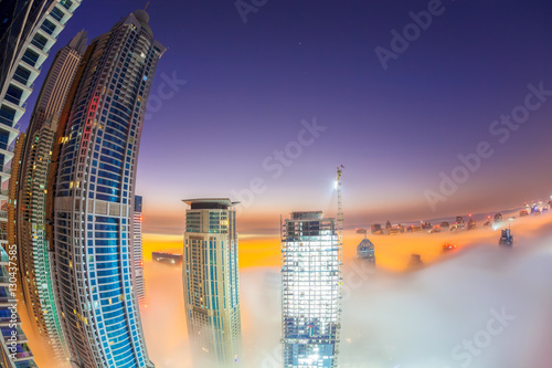 Fototapeta premium Dubai Marina is covered by early morning fog in Dubai, United Arab Emirates