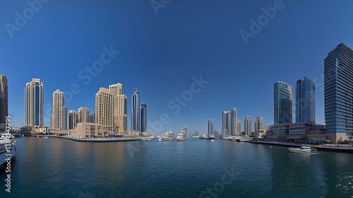 Obraz premium Dubai Marina panorama yachts, skyscrapers, sunny day, waterfront