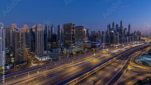 Fototapeta premium Dubai Marina skyscrapers aerial top view before sunrise from JLT in Dubai night to day timelapse, UAE.