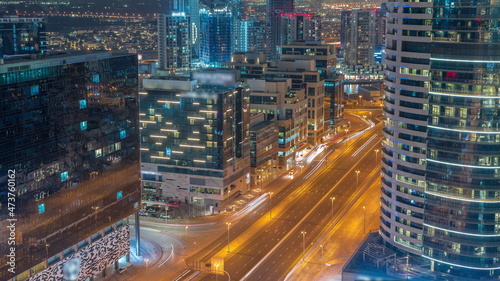 © HyperlapsePro, Obraz premium Dubai's business bay towers aerial night timelapse. Rooftop view of some skyscrapers