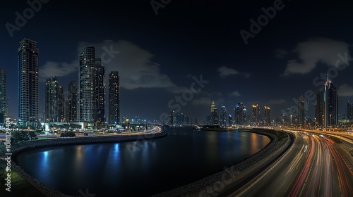 Fototapeta premium Dubai's city center shines at night, with towering skyscrapers and a busy...