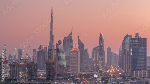 Naklejka premium Dubai skyline after sunset with beautiful city center lights and Sheikh Zayed road traffic timelapse, Dubai, United Arab Emirates