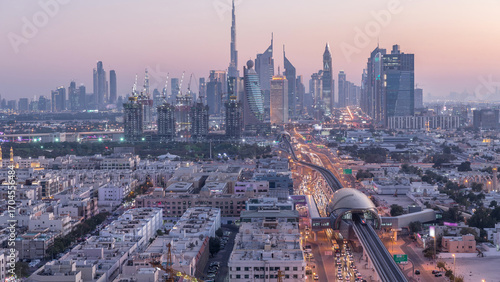 © HyperlapsePro, Obraz premium Dubai skyline after sunset with beautiful city center lights and Sheikh Zayed road traffic timelapse, Dubai, United Arab Emirates