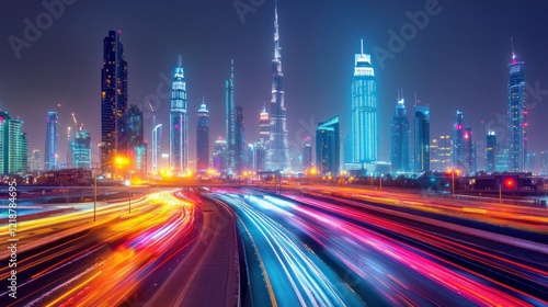© ZULFA, Obraz premium Dubai Skyline at Night: A Symphony of Lights and Motion