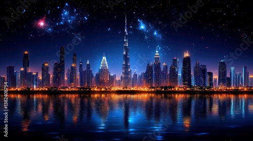 © TITISCAHYA, Obraz premium Dubai skyline at night, illuminated skyscrapers reflecting on water, starry sky