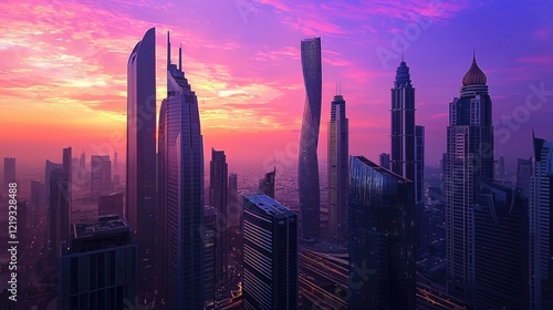 Fototapeta premium Dubai Skyline at Sunset with A Vibrant Panorama of Modern Architecture