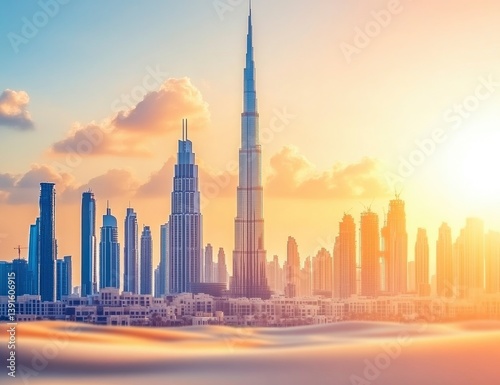 © MUdaylah, Obraz premium Dubai Skyline at Sunset with Desert Sand and Colorful Sky