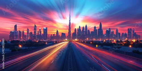Fototapeta premium Dubai Skyline at Sunset with Light Trails