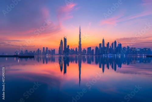 Fototapeta premium Dubai Skyline at Sunset with Reflection in the Water